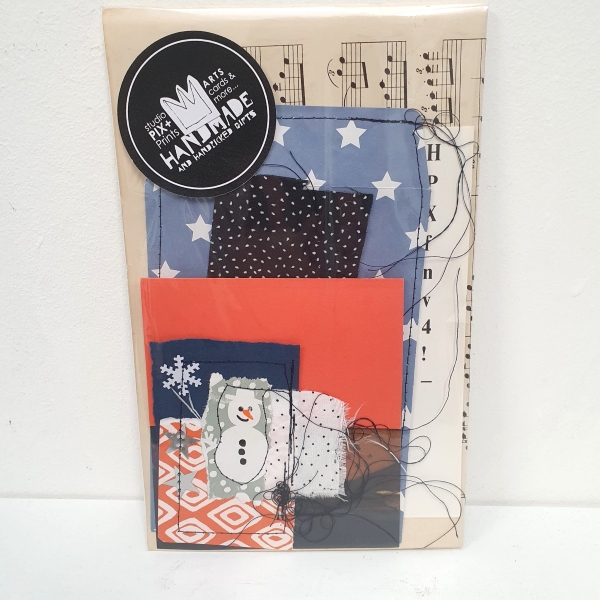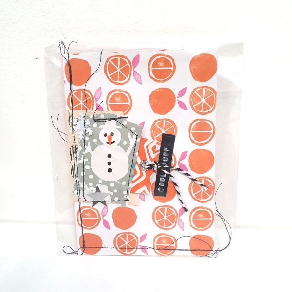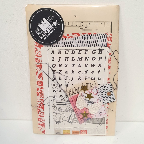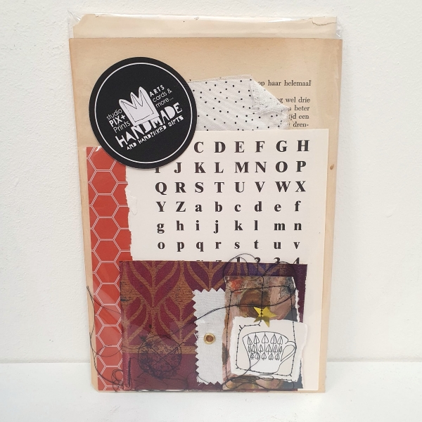 SPPP stationery Een pakketje met stof, diverse papiertjes en als pronkstuk een uniek, samengesteld papiercluster met stiksels.