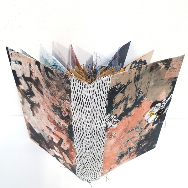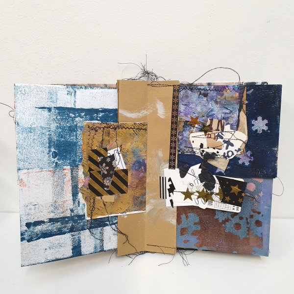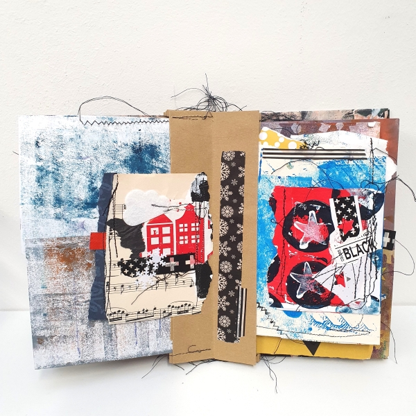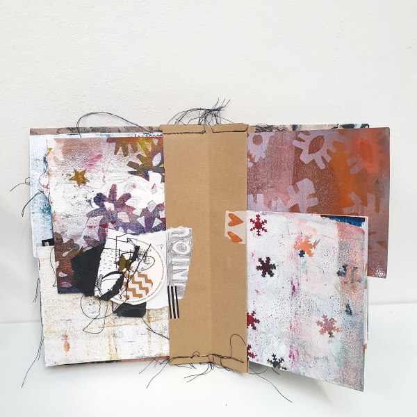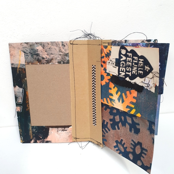 We beginnen met het kaften van twee stukken karton op A5-formaat met een deel van het abstracte werk van vorige week. Dit abstracte werk kan verder worden verfraaid met gekleurde (gel)pennen, acrylstiften of fineliners. Daarnaast is het mogelijk om bepaalde delen extra te accentueren met stiksels.