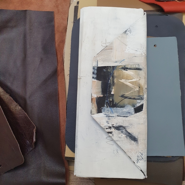 Omdat de omslag van het boekje meer op een envelop lijkt dan een standaard kaft, gaan we het boekwerk stapsgewijs kaften. zorg dat het meest interessante stuk op de driehoekige omslag past. Denk er na het kaften ook aan dat de binnenkant mooi afgewerkt wordt. Elk deel van de kaft hebben we volledig ingesmeerd met een lijmstift en de zijkanten netjes ingeknipt zodat deze konden worden omgevouwen en verlijmd aan de binnenkant. De zij stroken van rug hebben we ingeknipt, omgevouwen en vastgelijmd voor extra stevigheid.