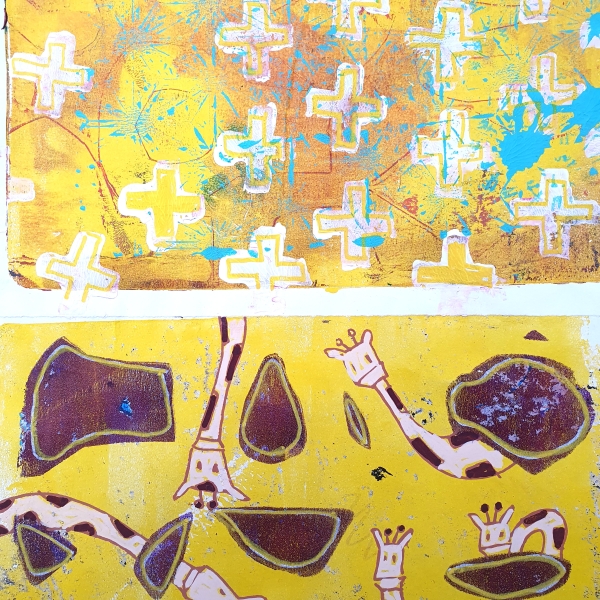 Samenvatting: We zijn begonnen op wit 80 grams papier. Op de foto naast het thema zie je twee voorbeelden van design in lagen. Het bovenste deel is na het gelliprinten bestempeld met witte plusjes en vervolgens met gele stift en blauwe spetters verfraaid. In het geel/bruine design eronder werd ik duidelijk geïnspireerd door de giraf en heb ik giraffenkoppen met lange nekken getekend. Het lijken wel giraffo-slakken. Eenmaal ingekleurd zag het geheel er gezellig uit. Zoiets kun je van te voren gewoon niet bedenken!