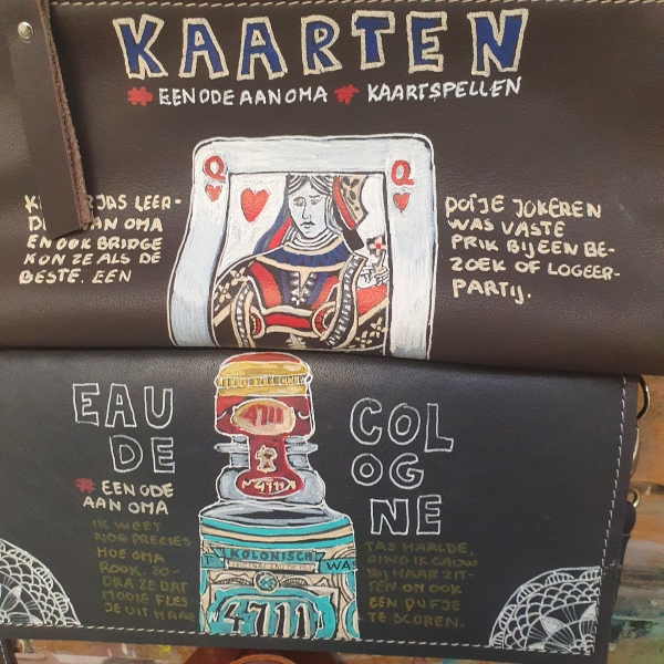 Na een paar dagen broeden kwam ik op het idee om mijn overbuurvrouw te vragen. Haar atelier zit misschien net op 10 meter afstand van het mijne. Zij maakt herinneringstassen uit jassen, tassen en andersoortig leren voorwerpen. Ze is een echte vakvrouw. Wat nou als ik op acht tassen van haar mag tekenen? Dat zou me zo ontzettend gaaf lijken! Dan kan zij haar herinneringstassen op een kunstzinnige manier op de kaart zetten en ik mijn cursus imperfect tekenen promoten. Op deze manier brengen we het beste van onze twee werelden samen.